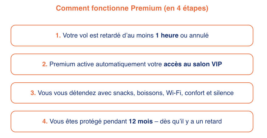 Vol Retardé Premium est notre service exclusif qui vous permet d’accéder plus de 1500 salons VIP dès que votre vol est retardé de seulement 1 heure ou si votre vol a été annulé à la dernière minute.